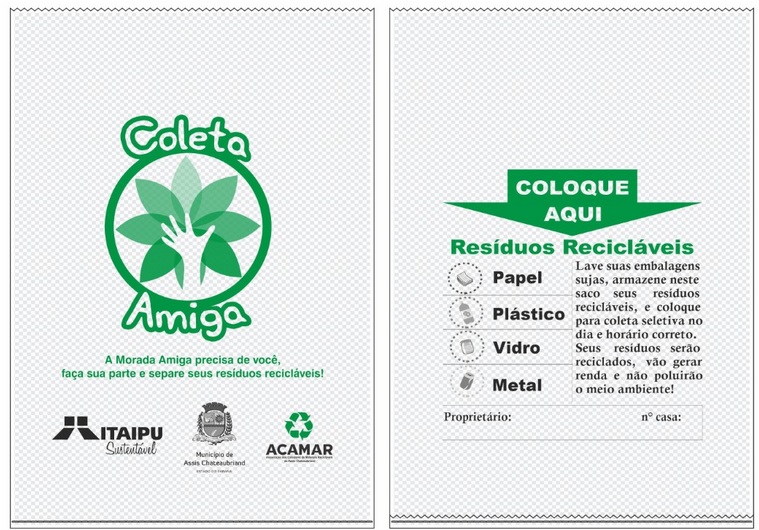 Enxágue as embalagens e as coloque no saco de ráfia, entregue pela Prefeitura Municipal em parceria com a Itaipu Binacional e depois, coloque na frente de sua casa, mas lembrando, é necessário que seja nos dias e períodos específicos, para o caminhão da “Coleta Amiga” passar recolhendo esses materiais, que são encaminhados para a Unidade de Valorização de Recicláveis do município.